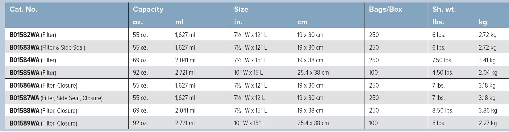 Specially designed for use with homogenizer blenders. Extra-heavy PET film and special features for easier and more efficient testing. Bags use a special laminated PET film for durability and a vertical nonwoven filter to separate solids for easy pipetting of the liquid sample. Contains a 250 micron polyester filter adhered vertically along the side of the 3 mil (0.76 mm) bag. Easy-pour side seal allows you to simply pour liquid out of the bag without also emptying solids.